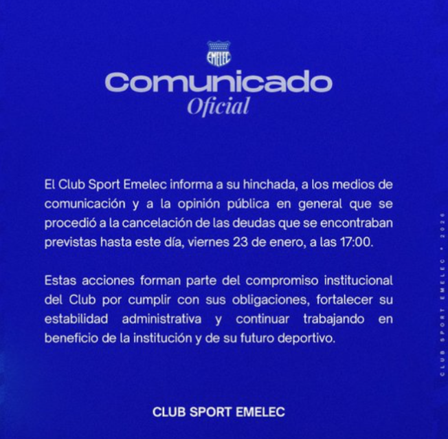 El Club Sport Emelec informó que logró ponerse al día con los pagos que vencían hasta el viernes 23 de enero de 2025, una gestión clave para impedir una nueva sanción deportiva. De no haber cumplido con estas obligaciones, el cuadro guayaquileño se exponía a una deducción adicional de seis puntos en la tabla de posiciones de la LigaPro 2026.